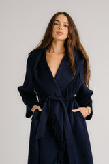 Oversized wool coat with a draped hood and tonal fringe detailing along the hem.