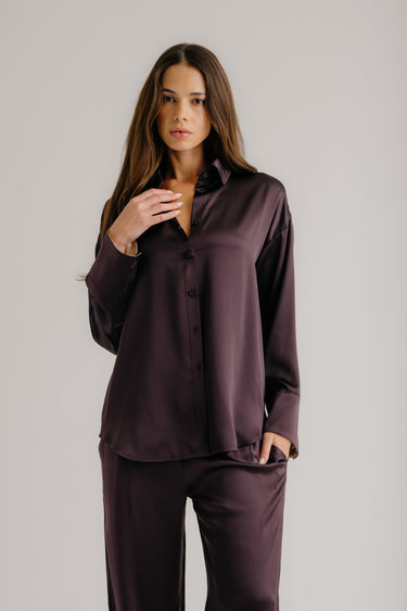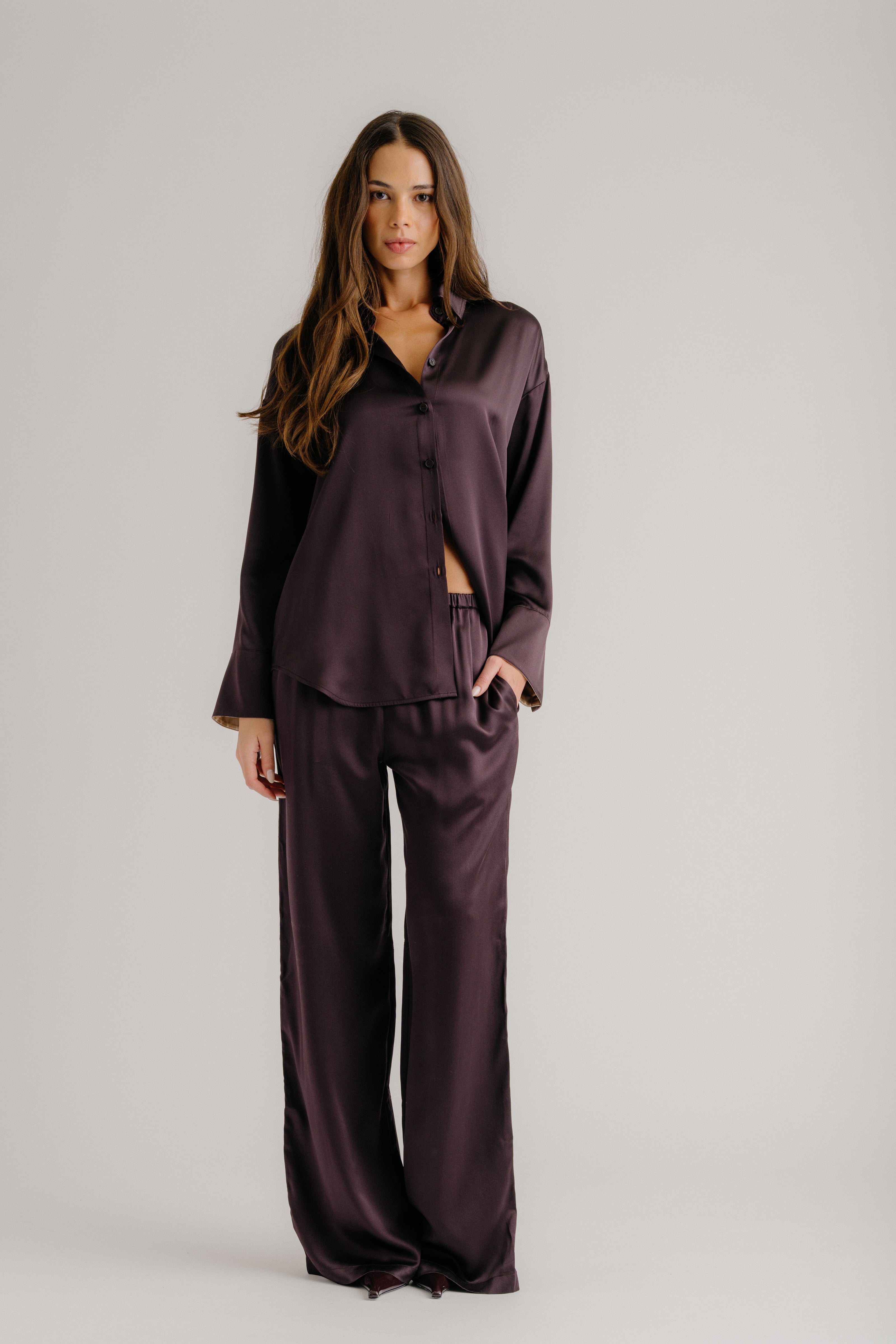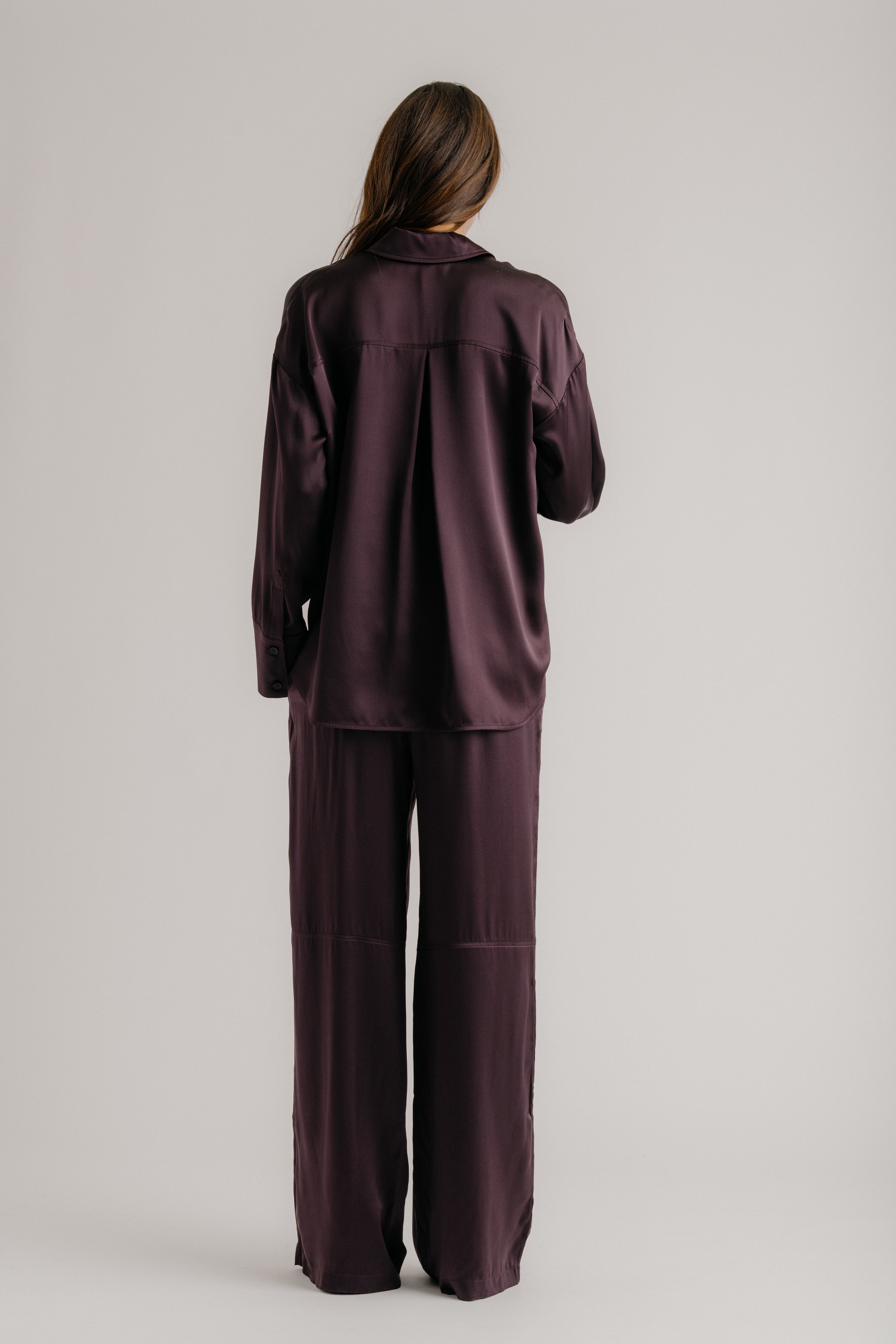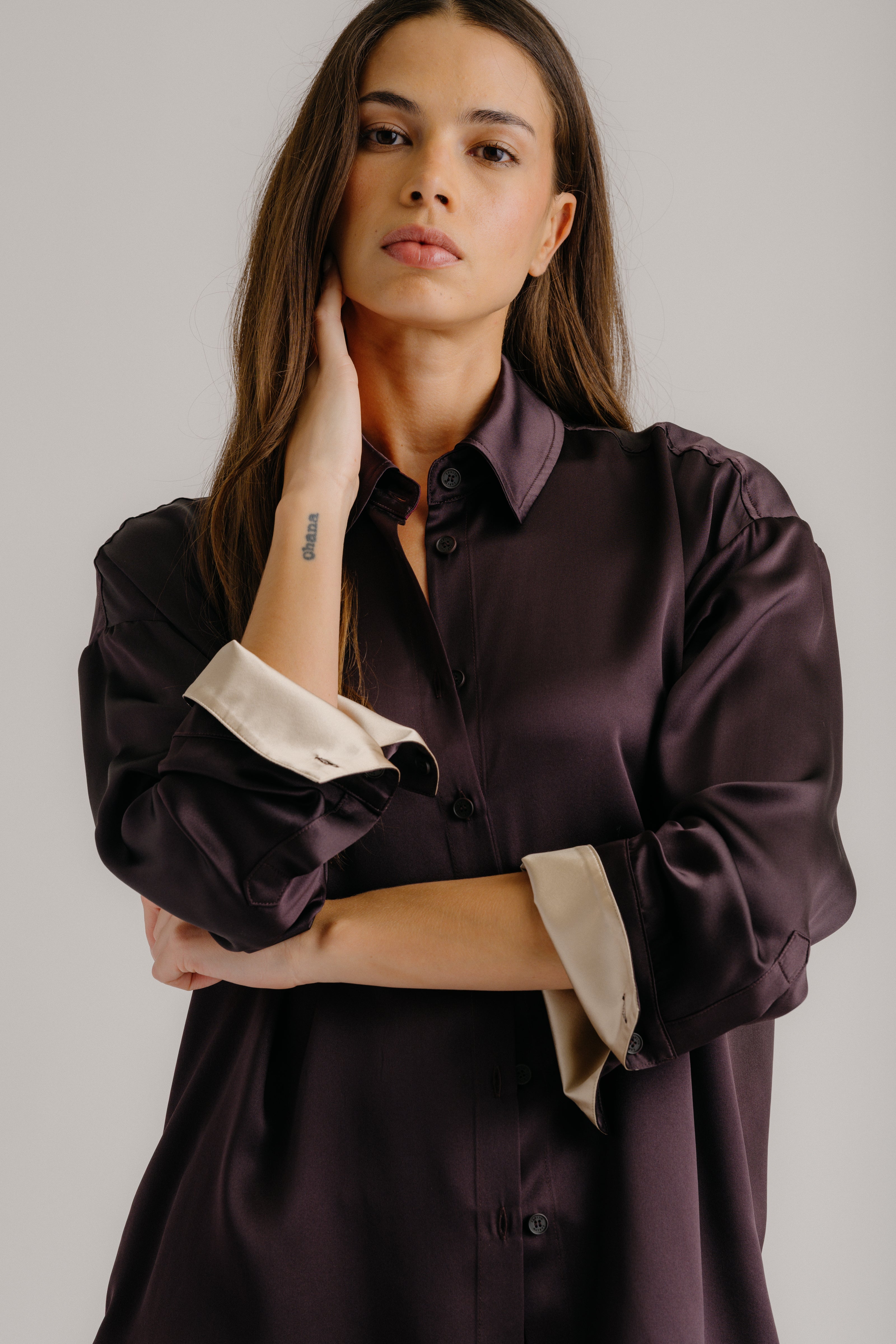 Relaxed long-sleeve button-down in 100% silk with subtle colorblock sleeve detail.