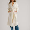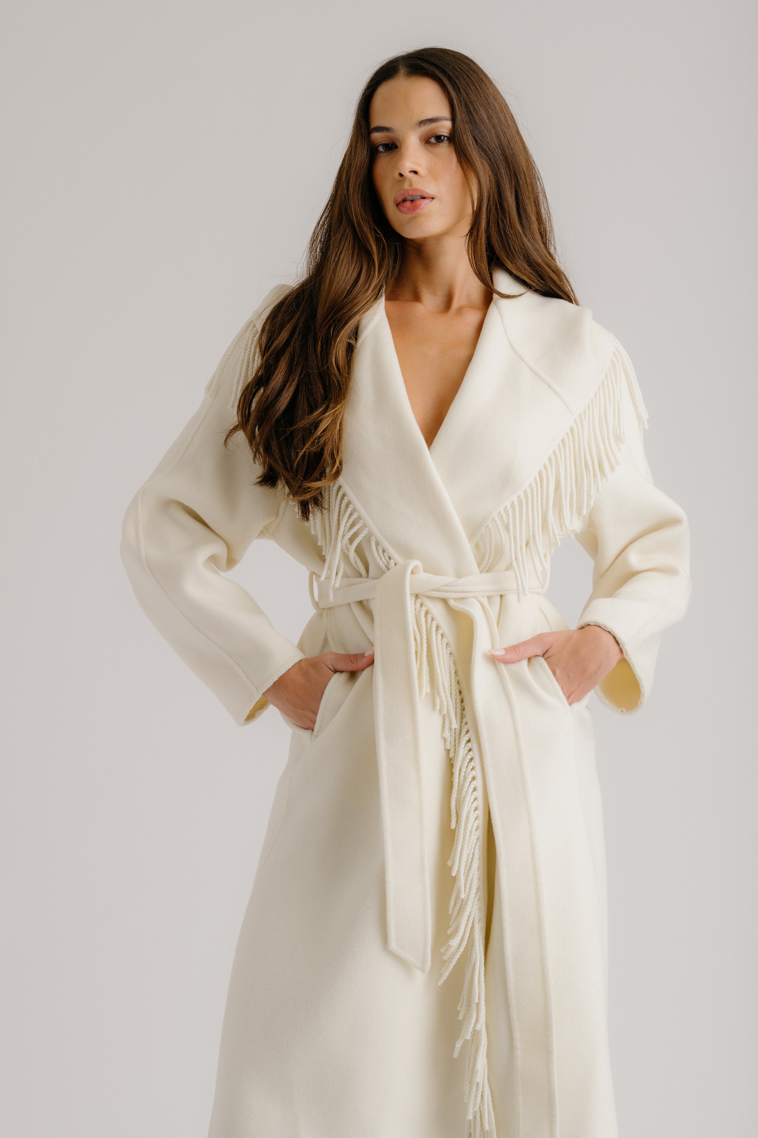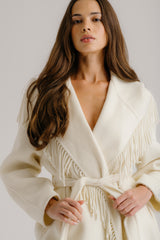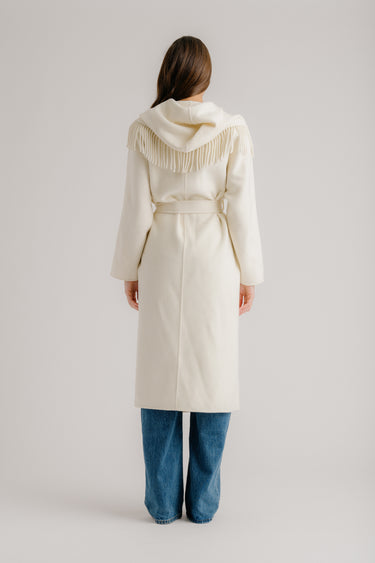 Oversized wool coat with a draped hood and tonal fringe detailing along the hem.