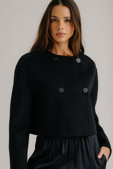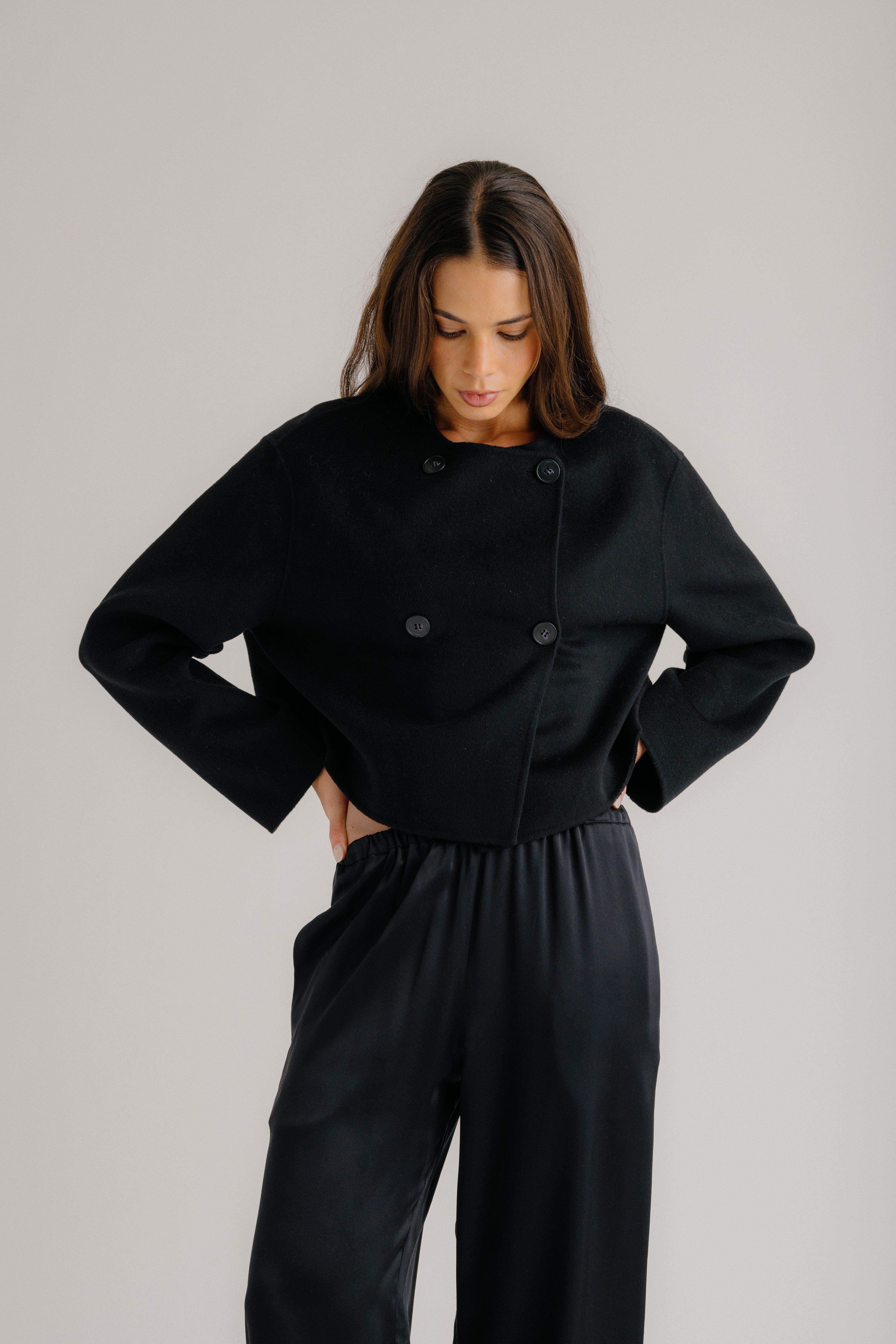 Cropped wool coat with a double-breasted front, structured shoulders, and sharp lapels.