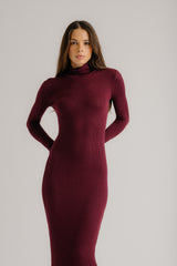 Full-length ribbed turtleneck dress with a slim silhouette and natural stretch.