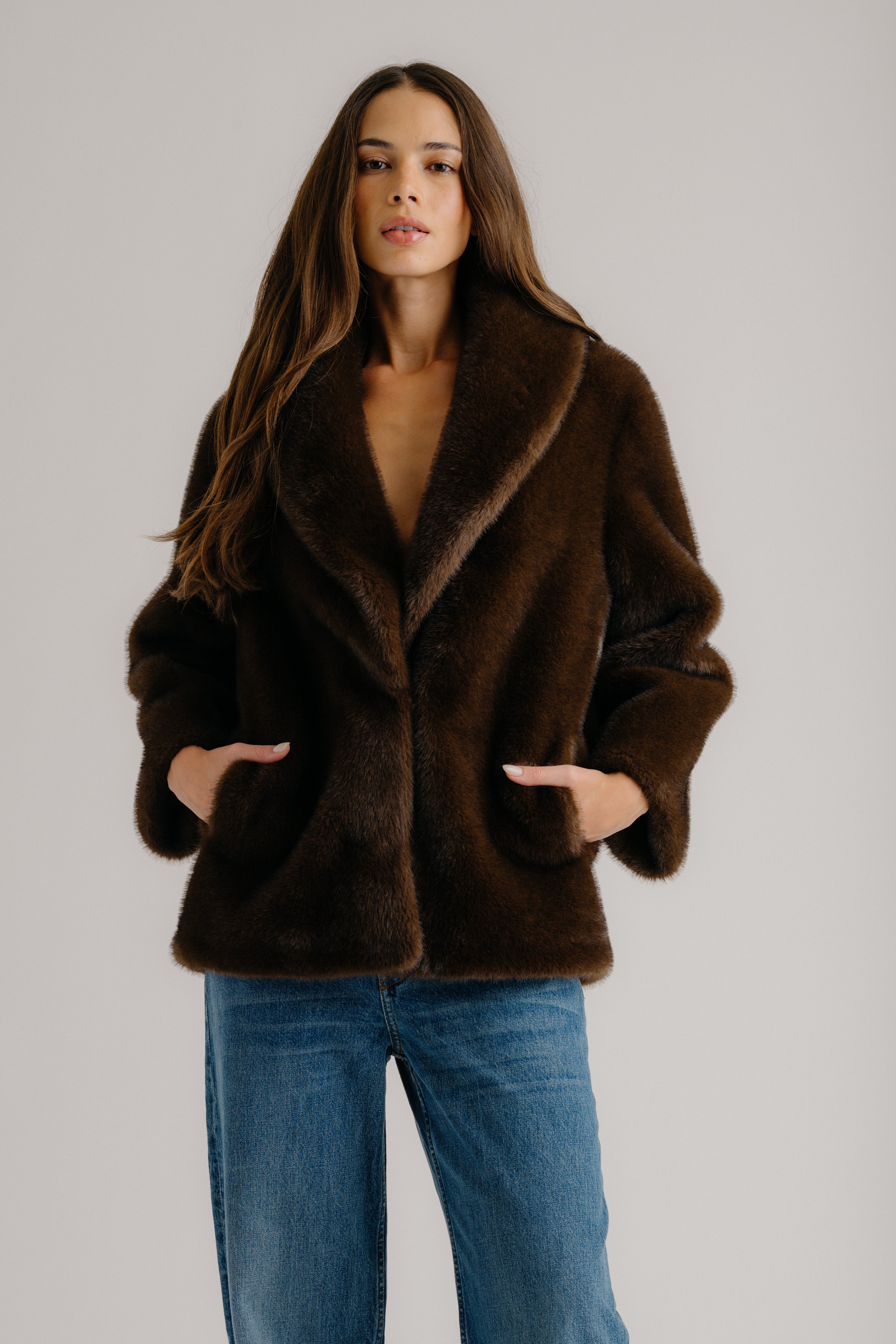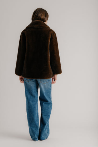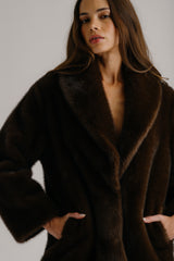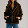 Shawl collar blazer in plush faux fur with a relaxed oversized silhouette.