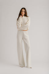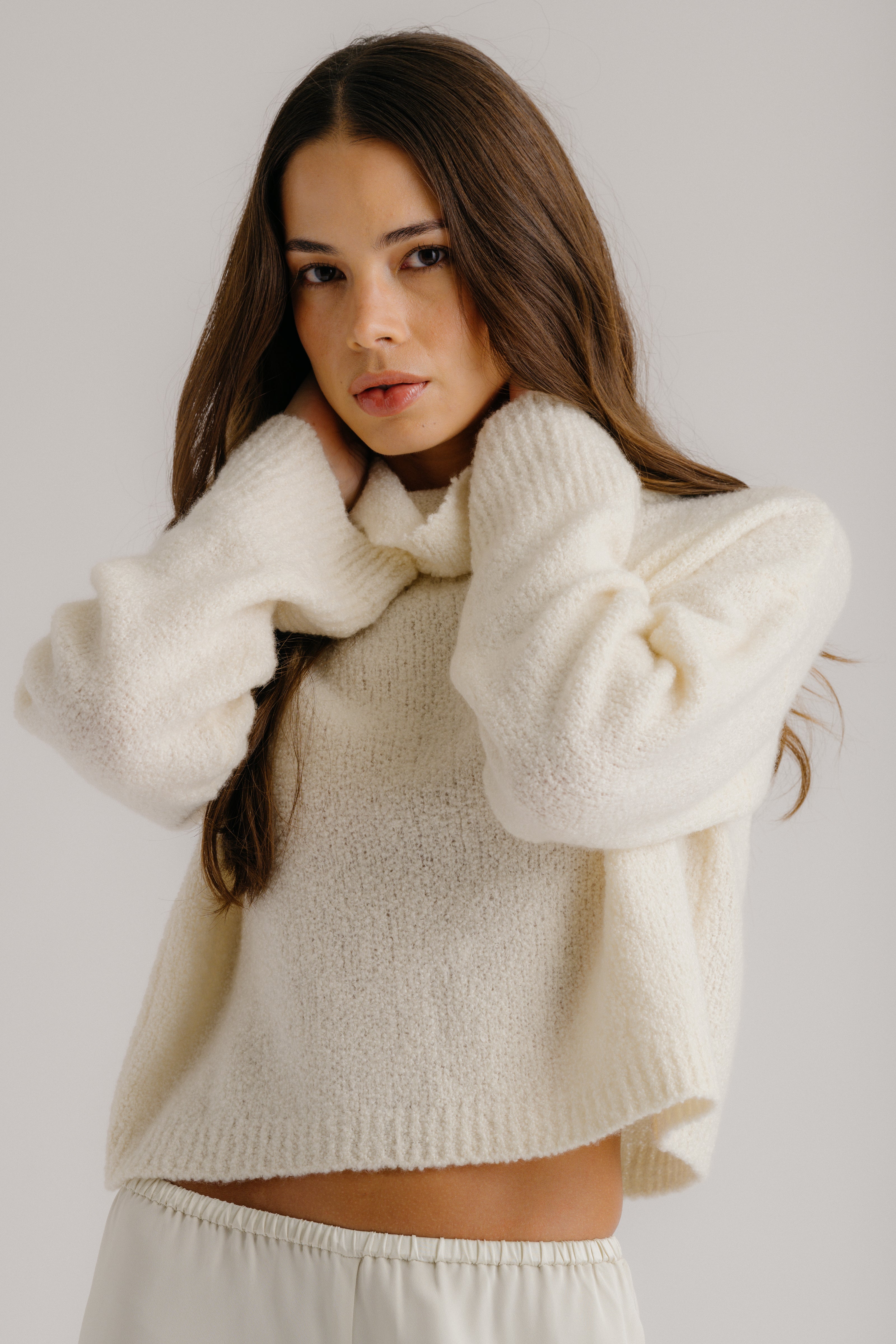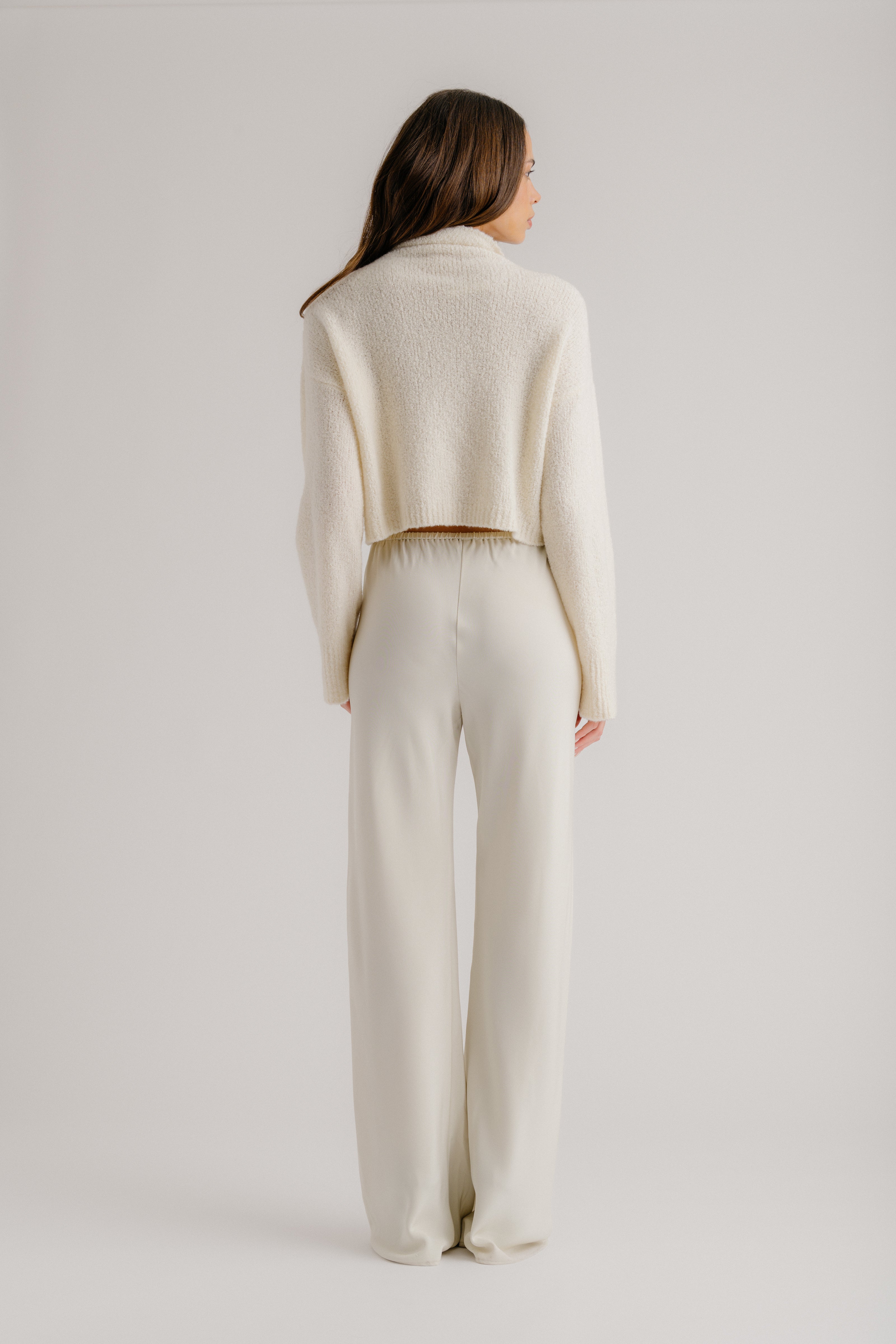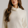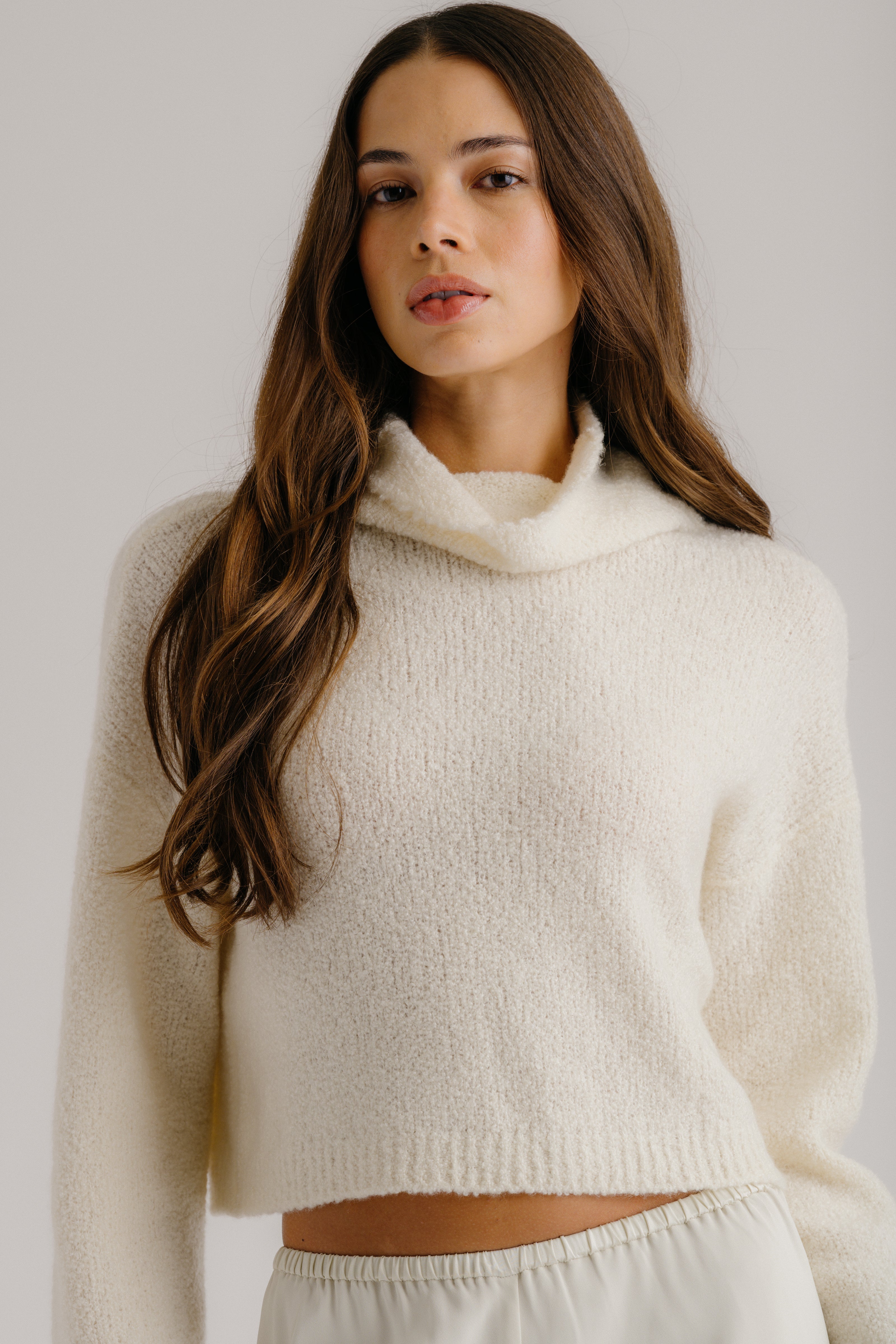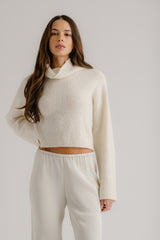 Cropped mock neck sweater in cashmere blend bouclé with a soft, textured finish and slouchy fit.