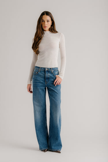 Fitted mock neck sweater in a delicate lace stitch crafted from ultrafine merino wool with lycra for subtle stretch.