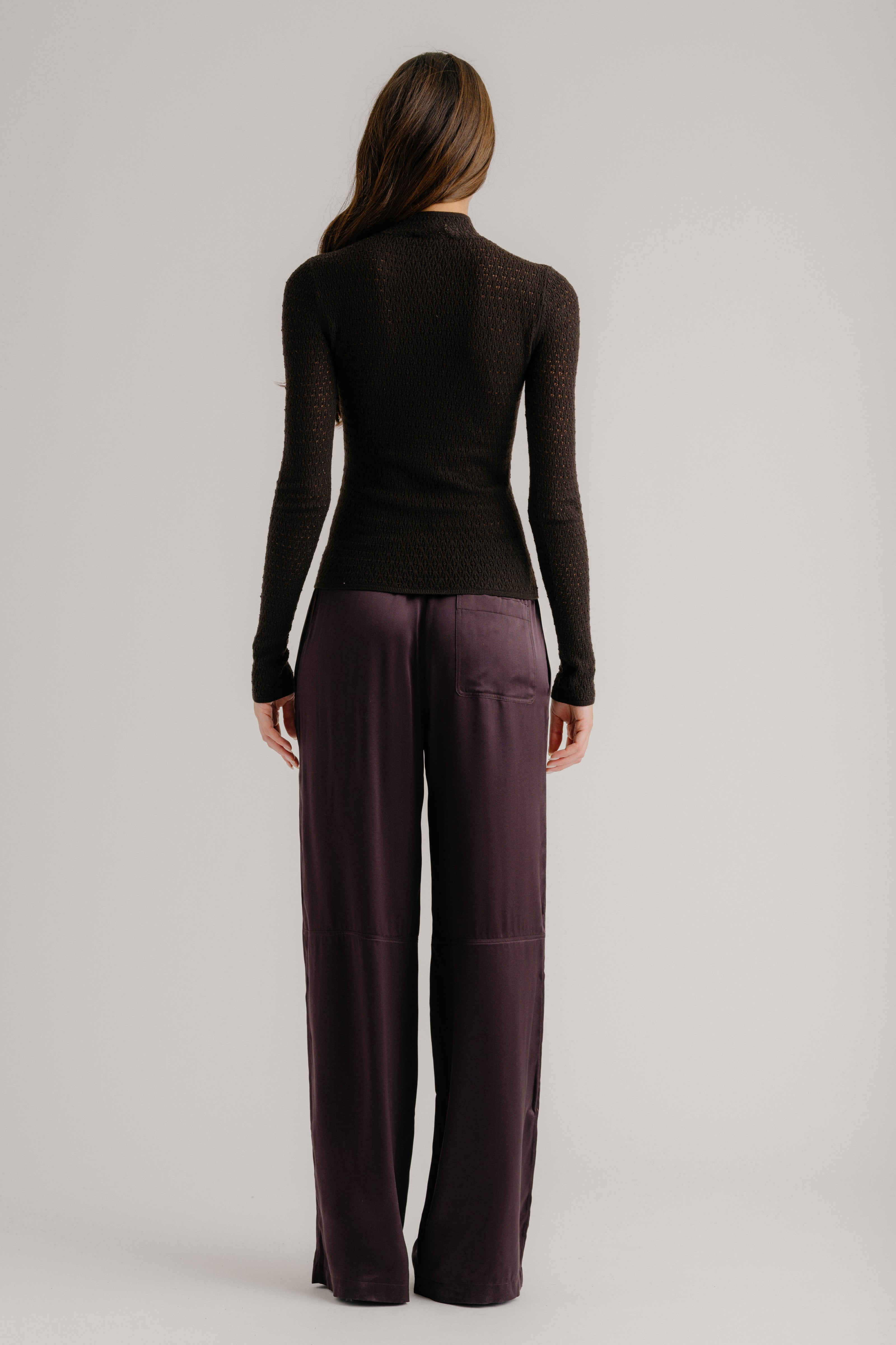 Fitted mock neck sweater in a delicate lace stitch crafted from ultrafine merino wool with lycra for subtle stretch.