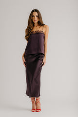 Bias-cut pull-on skirt in 100% silk with scallop trim detailing.