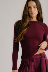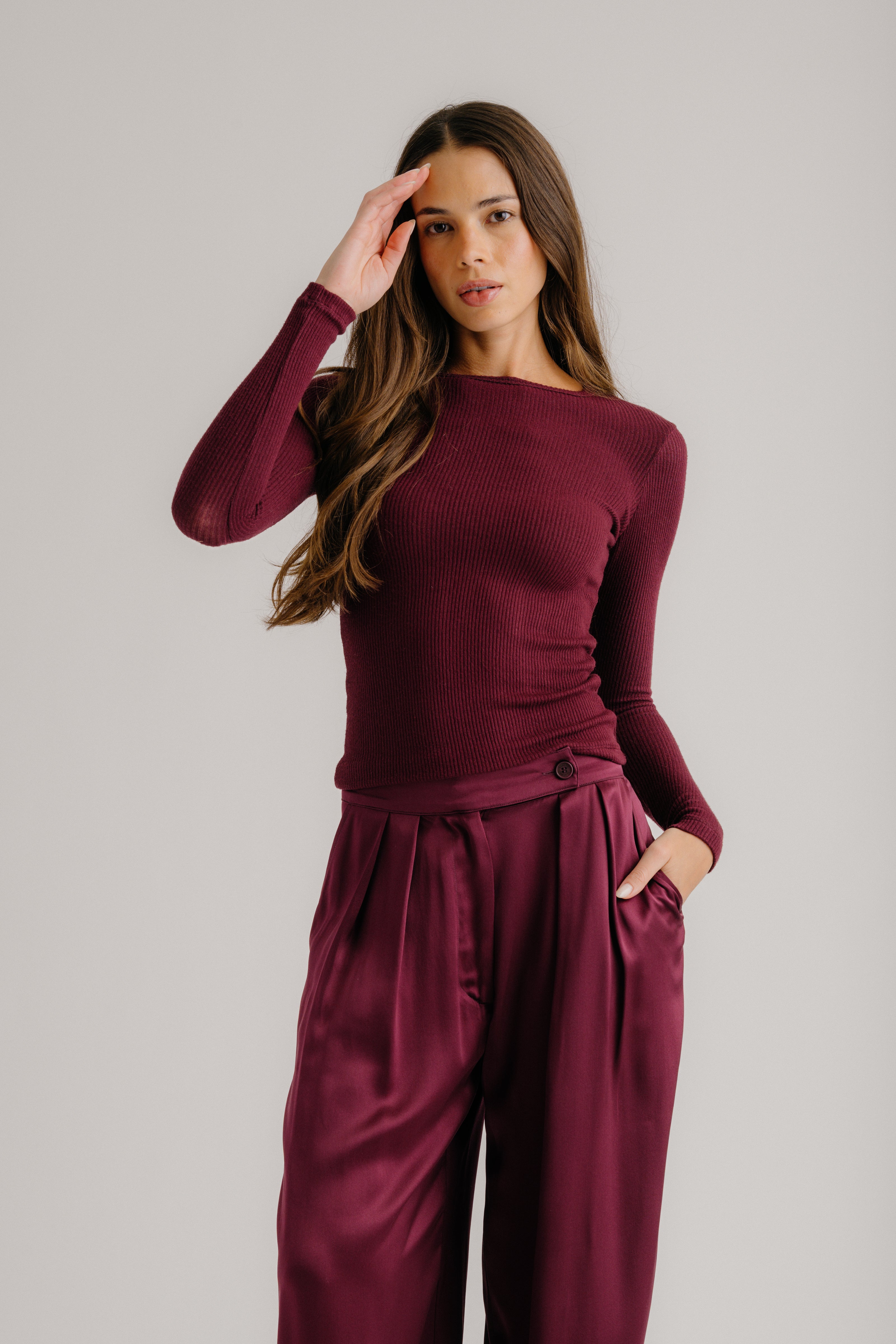 Fitted long-sleeve crewneck tee in ribbed knit.