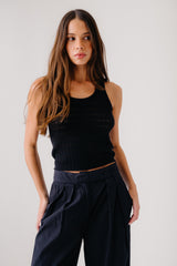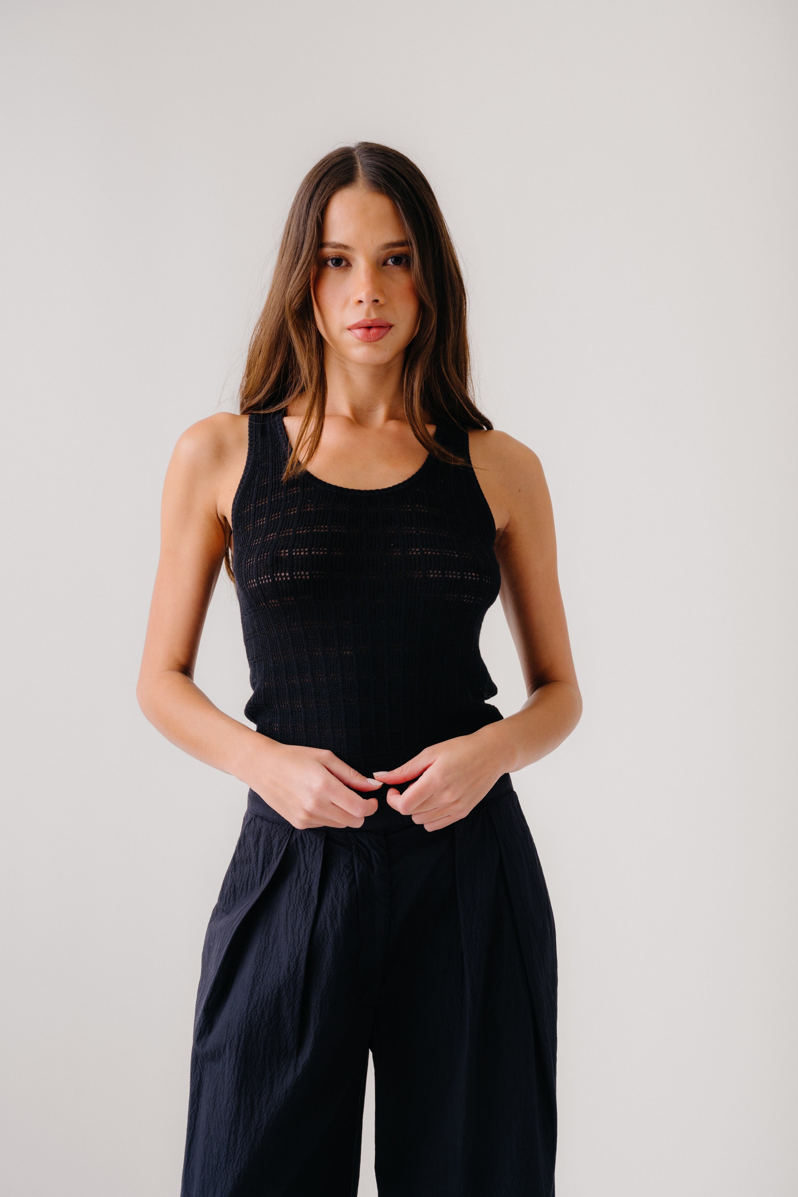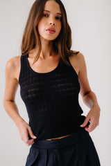 Pointelle stitch scooped neck tank in cotton silk cashmere.