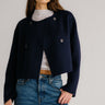 Cropped wool coat with a double-breasted front, structured shoulders, and sharp lapels.
